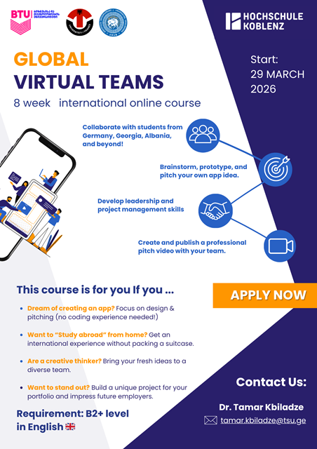 ივანე ჯავახიშვილის სახელობის თბილისის სახელმწიფო უნივერსიტეტის პარტნიორი კობლენცის (გერმანია) გამოყენებით მეცნიერებათა უნივერსიტეტი თსუ ეკონომიკისა და ბიზნესის ფაკულტეტის სტუდენტებს სთავაზობს ჩაერთონ “გლობალური ვირტუალური გუნდების “აპლიკაციების“ პროექტში“ (Global Virtual Teams „App” project) რომელშიც მონაწილეობას გერმანელ და ქართველ სტუდენტებთან ერთად, სხვა ქვეყნების წარმომადგენლებიც მიიღებენ.
