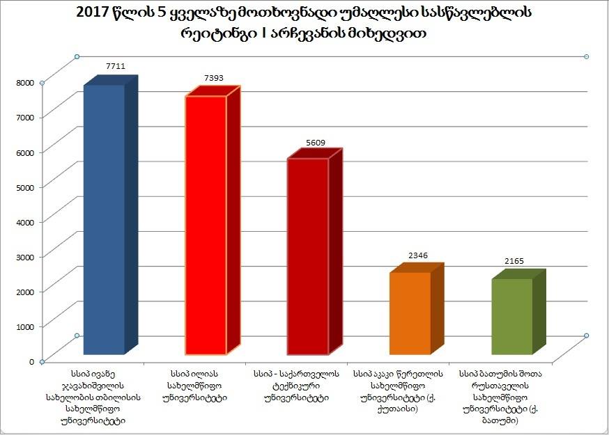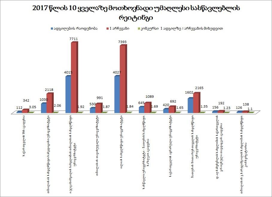 შეფასებისა და გამოცდების ეროვნული ცენტრის მონაცემებით, თბილისის სახელმწიფო უნივერსიტეტმა 2017 წლის ერთიან ეროვნულ გამოცდებზე 67 საბაკალავრო  საგანამანათლებლო პროგრამაზე 4015 ვაკანტური ადგილი გამოაცხადა. მიუხედავად იმისა, რომ თსუ-ს მინიმალური კომპეტენციის ზღვარი უმრავლეს საგანმანათლებლო პროგრამებზე ყველაზე მაღალი აქვს, ჩვენი უნივერსიტეტი პირველი არჩევანის მიხედვით ყველაზე მოთხოვნადია. პირველი უნივერსიტეტი პირველ პრიორიტეტად 7711 აბიტურიენტმა დაასახელა, შესაბამისად, პირველი არჩევანის მიხედვით ერთ ადგილზე ყველაზე მაღალი კონკურსი თსუ-შია.